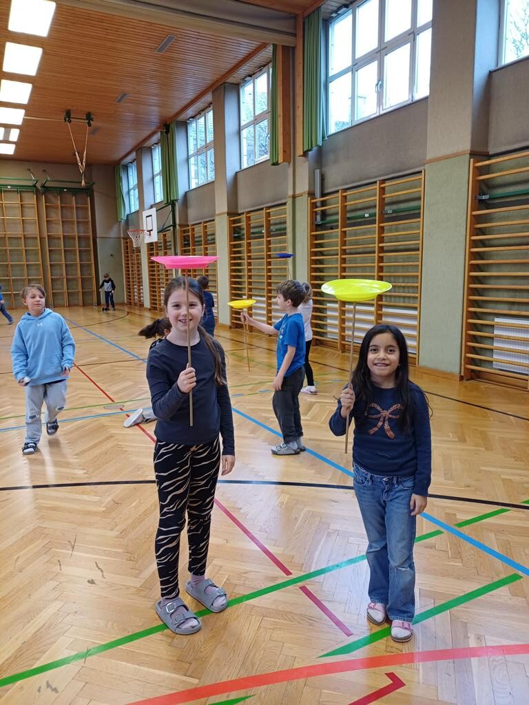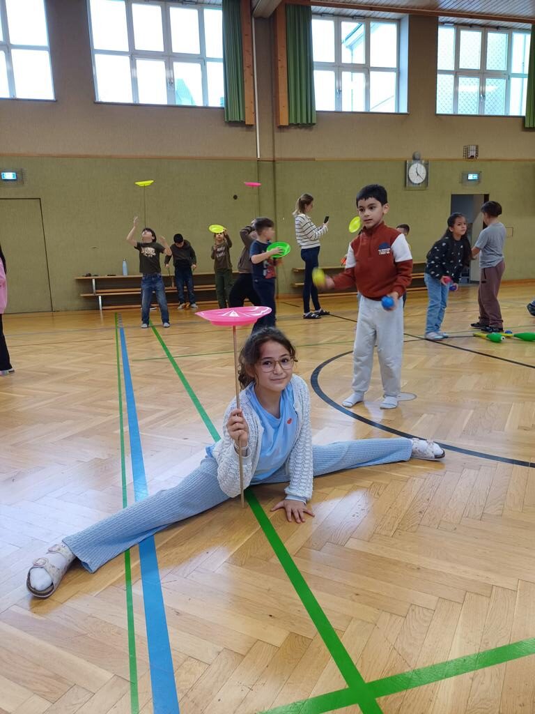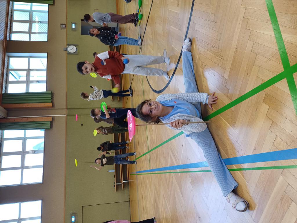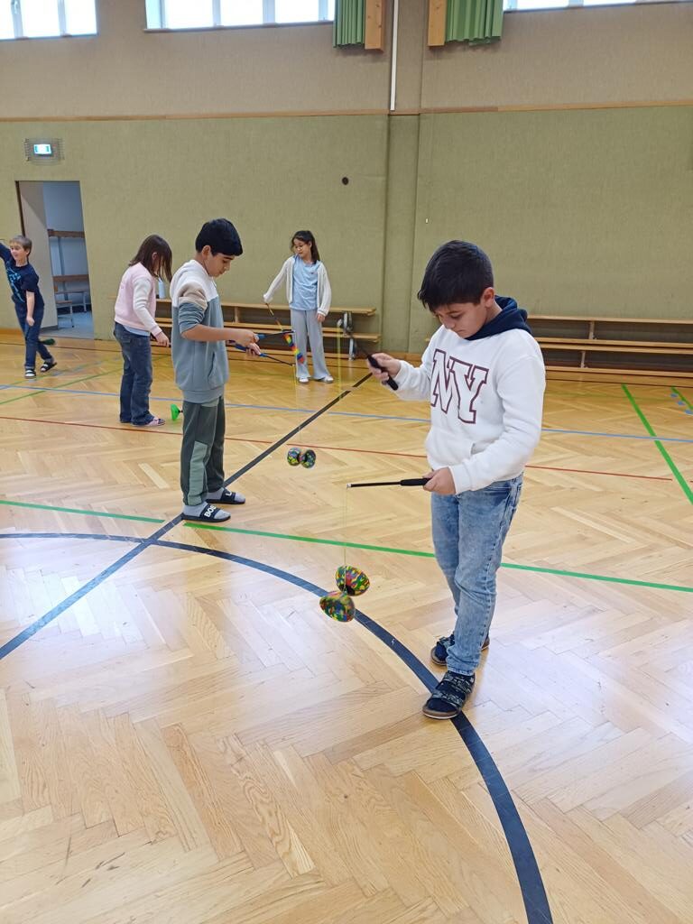Am Mittwoch war der Jongleur Andreas Faschinger bei uns zu Besuch. Er zeigte den Kindern die faszinierende Kunst des Jonglierens. Die Schülerinnen und Schüler durften selbst ausprobieren und mit Bällen, Tüchern und Keulen üben. Alle hatten viel Spaß und lernten, dass man mit Geduld und Übung tolle Dinge schaffen kann. Es war ein schwungvoller und lustiger Vormittag!
